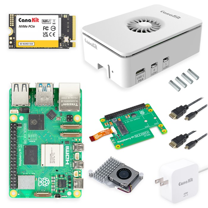 Transform your Raspberry Pi computing experience with the CanaKit Raspberry Pi Desktop PC with NVMe. The CanaKit Raspberry Pi Desktop PC offers a leap in performance with the fastest version of the Raspberry Pi 5 with 8GB RAM, and included NVMe pre-loaded with the 64 bit Raspberry Pi OS. The storage performance of the NVME SSD provides up to 10x faster read and write data transfer speeds compared to traditional Micro SD card storage solutions. This provides quicker boot times, swift application loading and smoother overall system performance.Housed in a very sleek and compact case, the CanaKit Raspberry Pi 5 Desktop PC is not only powerful but also aesthetically pleasing. It's small footprint makes it perfect for any workspace, whether setting up a home office, media center or educational workstation.The device comes fully assembled for convenience, eliminating the need for tedious hardware assembly tasks such as mounting the cooling system and installing the M.2+ HAT with spacers and screws. The CanaKit Raspberry Pi 5 Desktop PC with NVMe is fully assembled for plug-and-play operation - simply plug in your USB Keyboard/Mouse and connect to an HDMI TV or monitor for operation.The CanaKit Raspberry Pi 5 Desktop PC includes the CanaKit 45W PD USB-C Power Supply for the Raspberry Pi 5, to allow for connectivity of high-power devices to the Raspberry Pi 5.Features:-Fully assembled for plug-and-play operation-Raspberry Pi 5 with 8GB RAM -Quad-Core Arm Cortex-A76 processor at 2.4GHz-Available with 512GB or 1TB PCIe NVMe Storage-NVMe pre-loaded with Raspberry Pi 64 Bit OS-Official M.2+ HAT-CanaKit Turbine White Case for the Pi 5-Active Cooler-CanaKit 45W USB-C PD Power Supply-Set of 2 Micro HDMI to HDMI Cables (6-foot each)